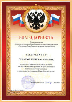 Благодарность администрации МОУ "СОШ № 71" г. Оренбурга за значительные успехи классного руководителя 4-А класса в организации деятельности учащихся в рамках программы "Одаренные дети" (Приказ № 01-10-43 п. 1 от 25.05.2010 г.).